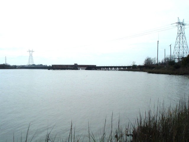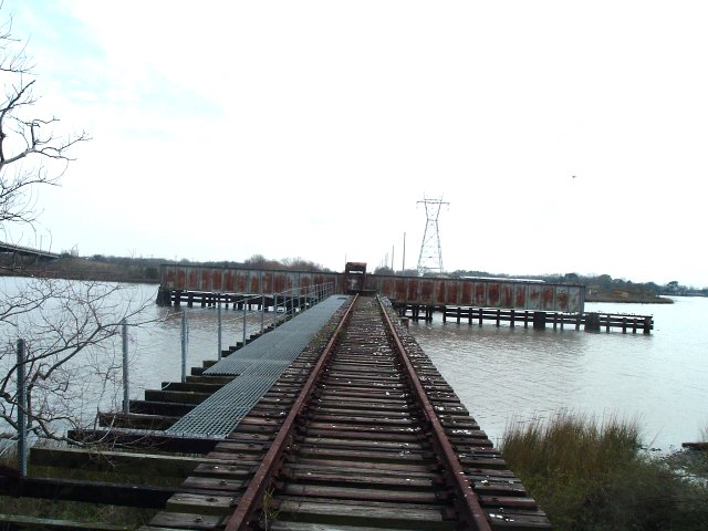 The abandoned railroad line crosses Dickinson Bayou on a swing bridge which is still rusting slowly in place, as shown in this image from Google Earth. Across the bayou, you can see the track of the old Highway 146 where it continues south toward Galveston. On the left is the high bridge which replaced the old highway draw bridge that once stood next to the railroad swing bridge.
