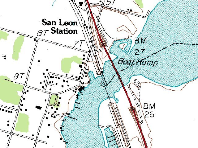 ![]() Finally, there it was in front of me, a grand old lady from railroading history. According to this geodetic survey map, the San Leon Depot once stood not far from the railroad bridge.